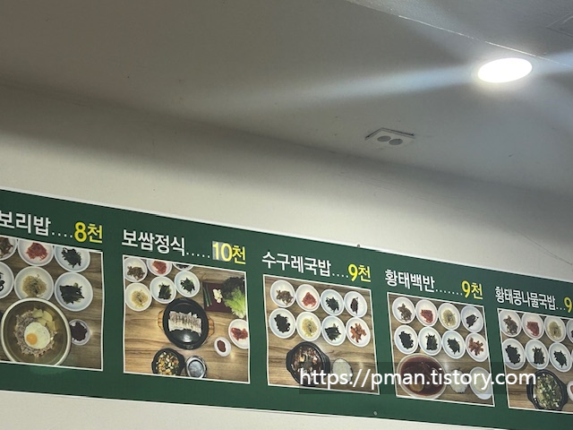 메뉴는 보리밥, 보쌈정식, 수구레국밥, 황태백반, 황태콩나물국밥.